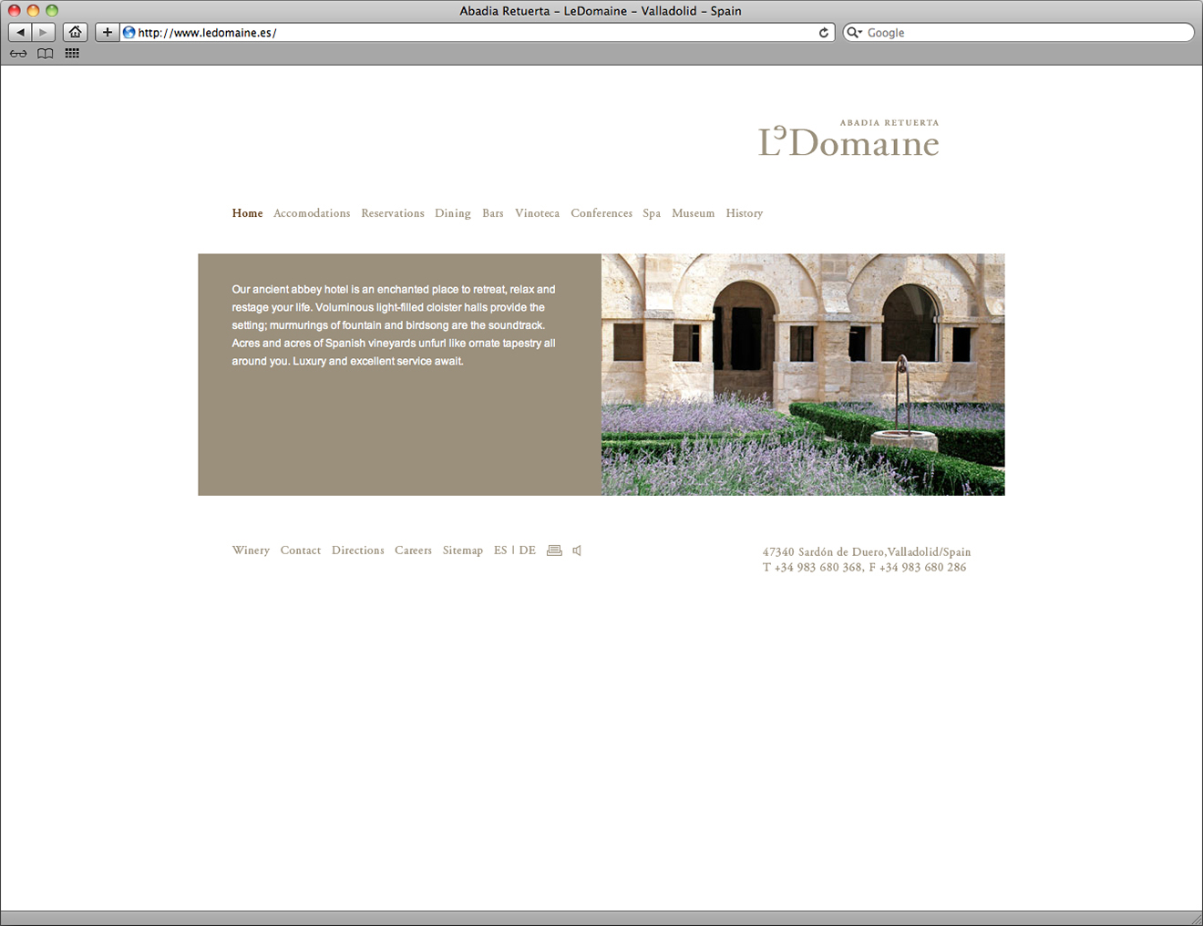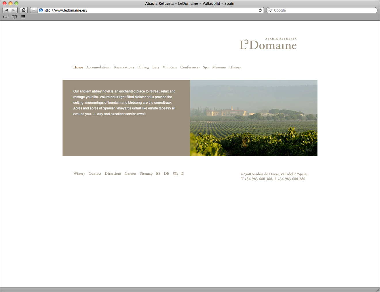The Abadia Retuerta LeDomaine luxury hotel resulted from the restoration of a 12th-century Spanish cultural heritage site, an ancient Premonstratensian abbey. The estate includes an outdoor sculpture museum, the ancient church and cloister, a 1-star Michelin restaurant, the renowned Abadia Retuerta Winery and a spa designed by architects Diener +Diener. The website design therefore had complex functional demands, including online bookings, tours, the history, etc.