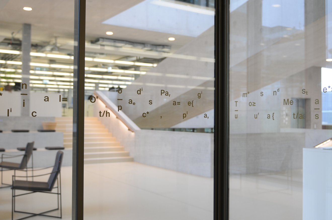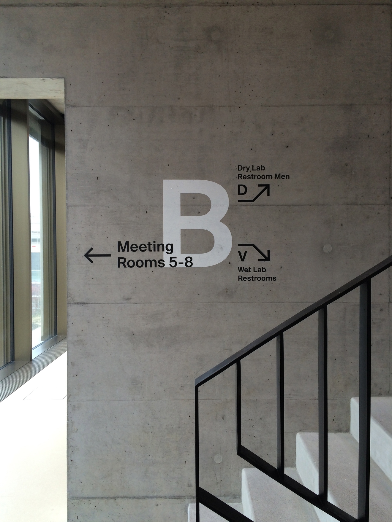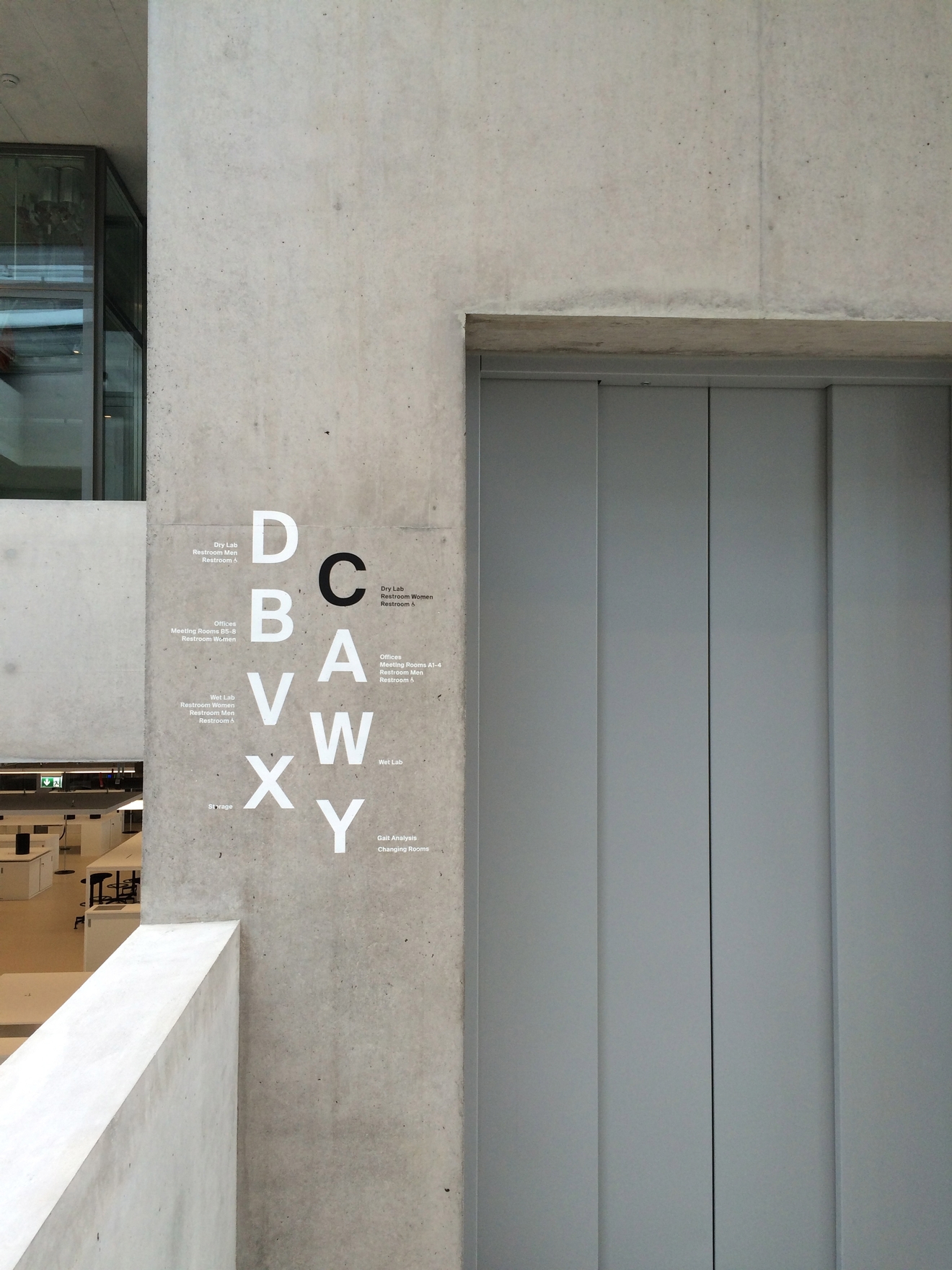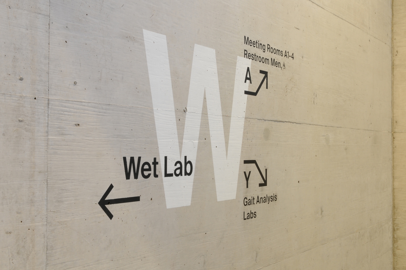 A research and development center for the advancement of musculoskeletal medicine, built by Basel architects Nissen Wentzlaff Architekten. With science, medicine and motion being the operative themes, our typographic solution (in Suisse Int’l Semi Bold) playfully references chemical formulas in guiding people to their destinations.