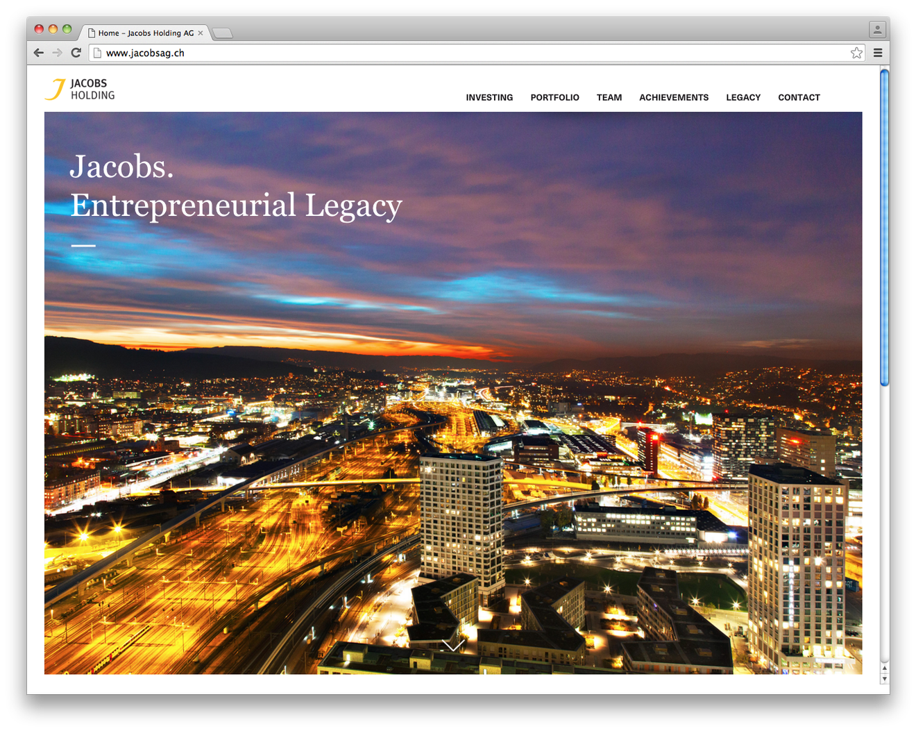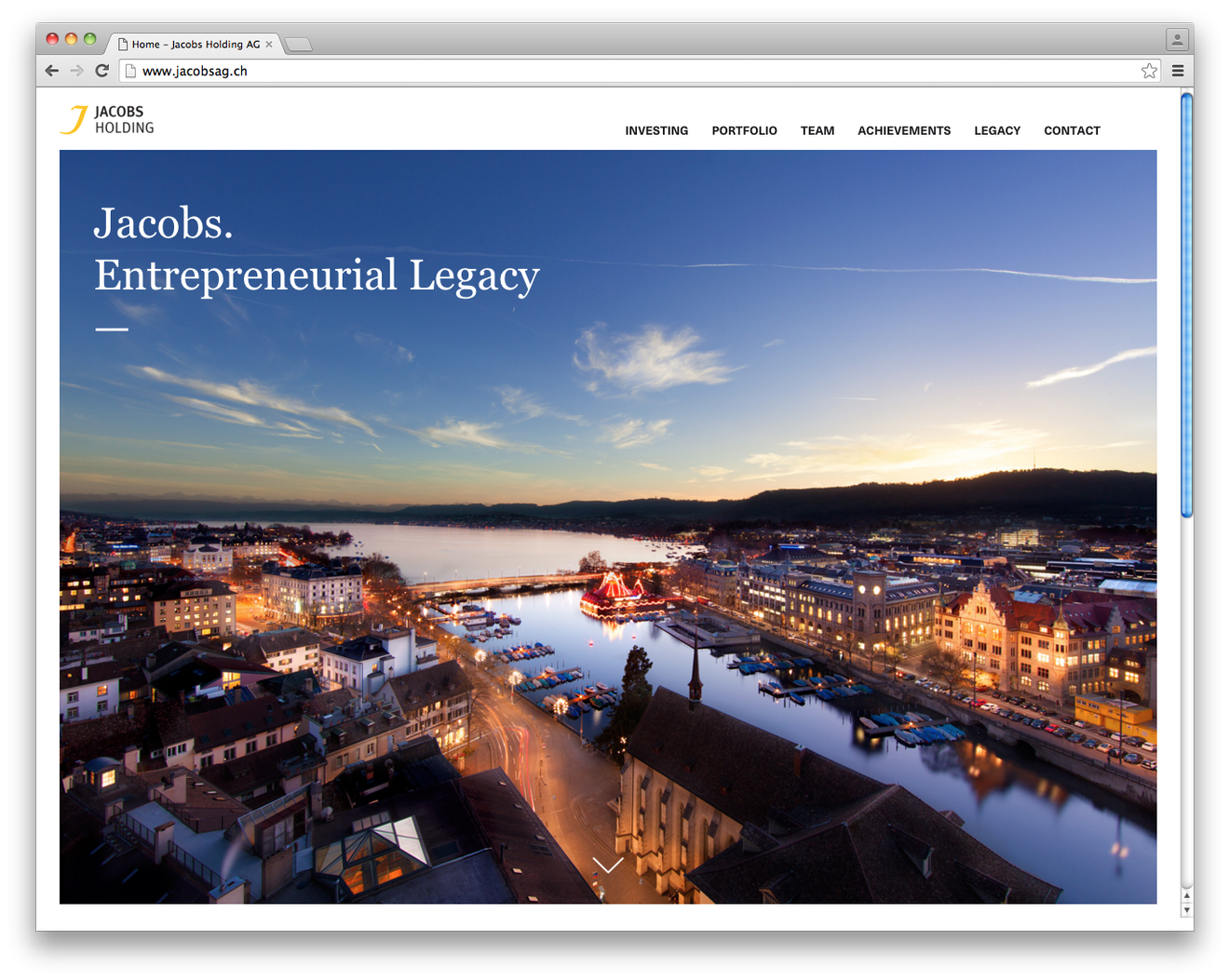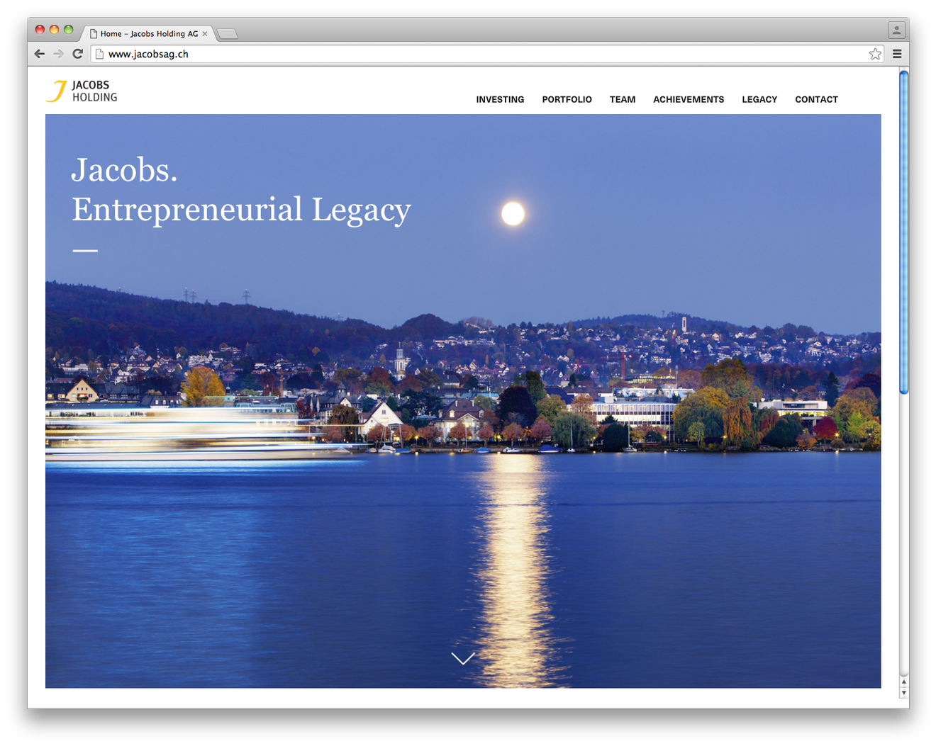 Our update of the Jacobs Holding website involved visualizing the metropolitan internationalism of the Jacobs endeavor, while remaining true to its local Zurich heritage and legacy. Photographers Roth+Schmid captured both with the Jacobs yellow in the autumn evening light of Zurich, their home at the lake.