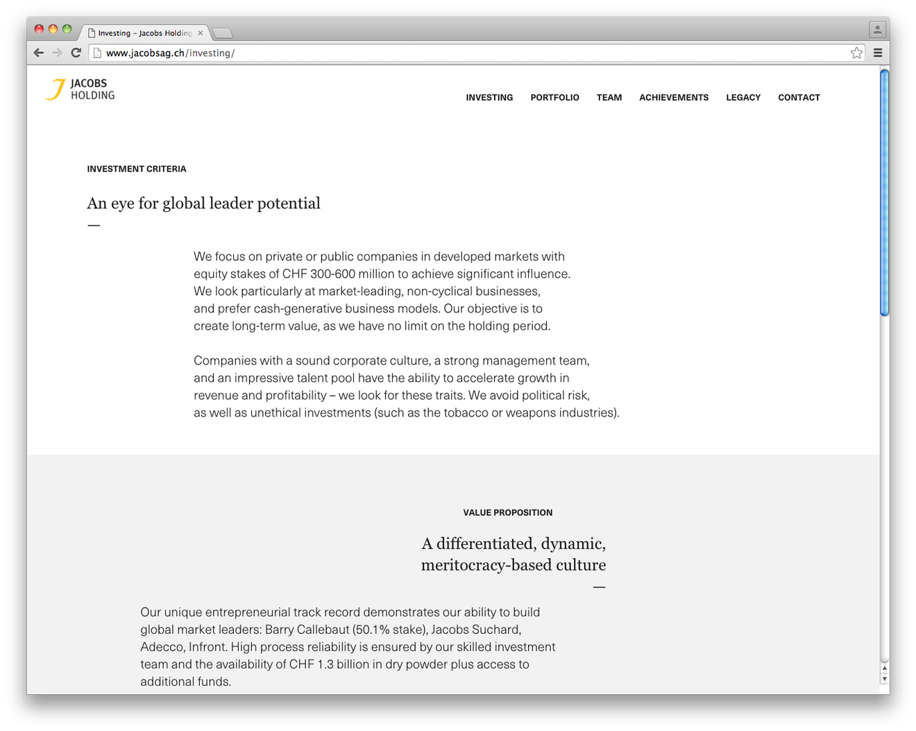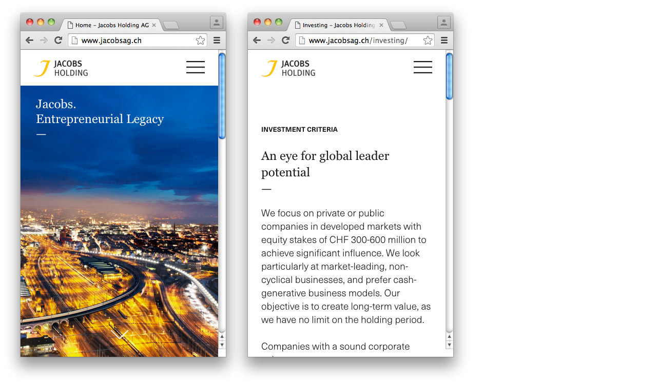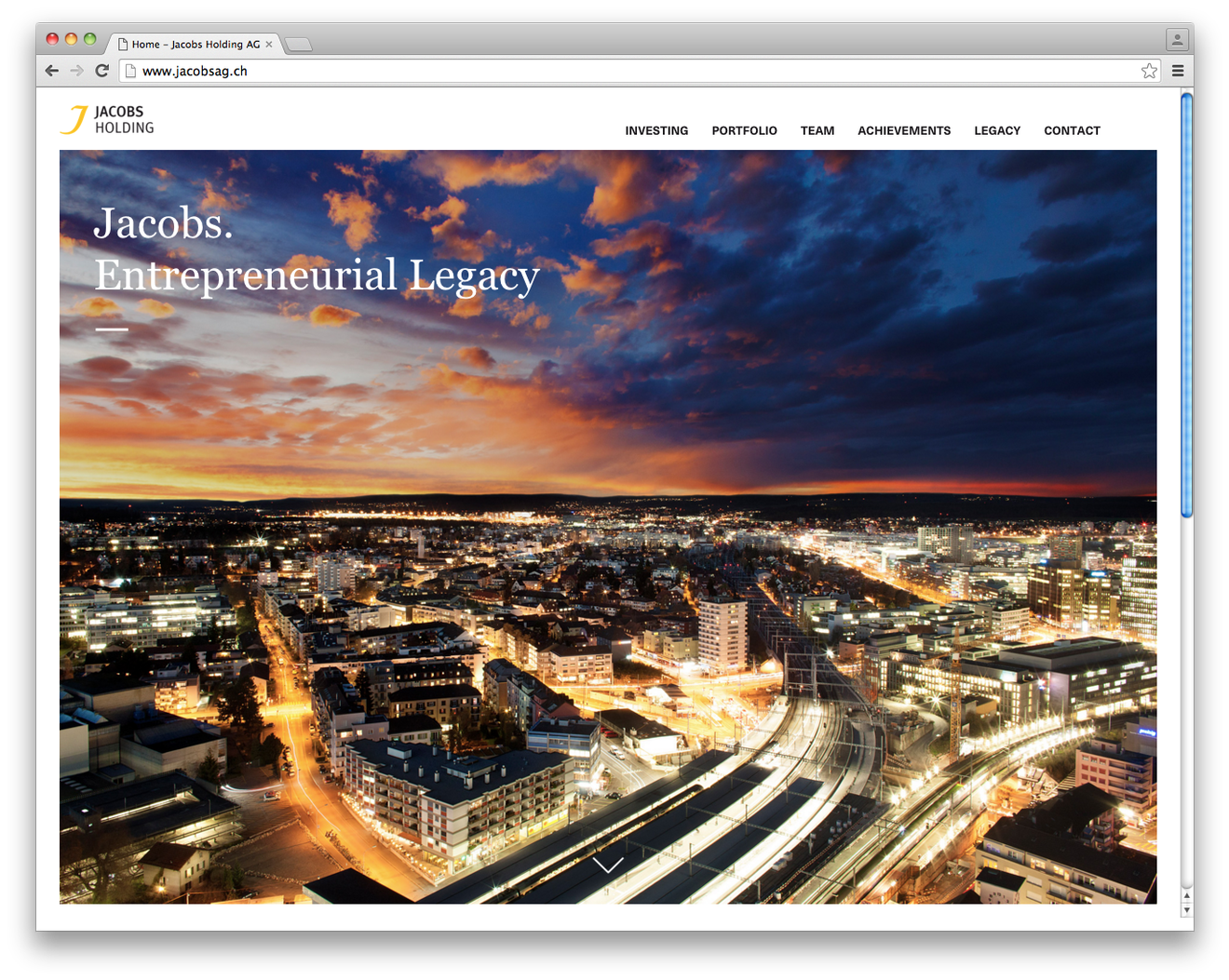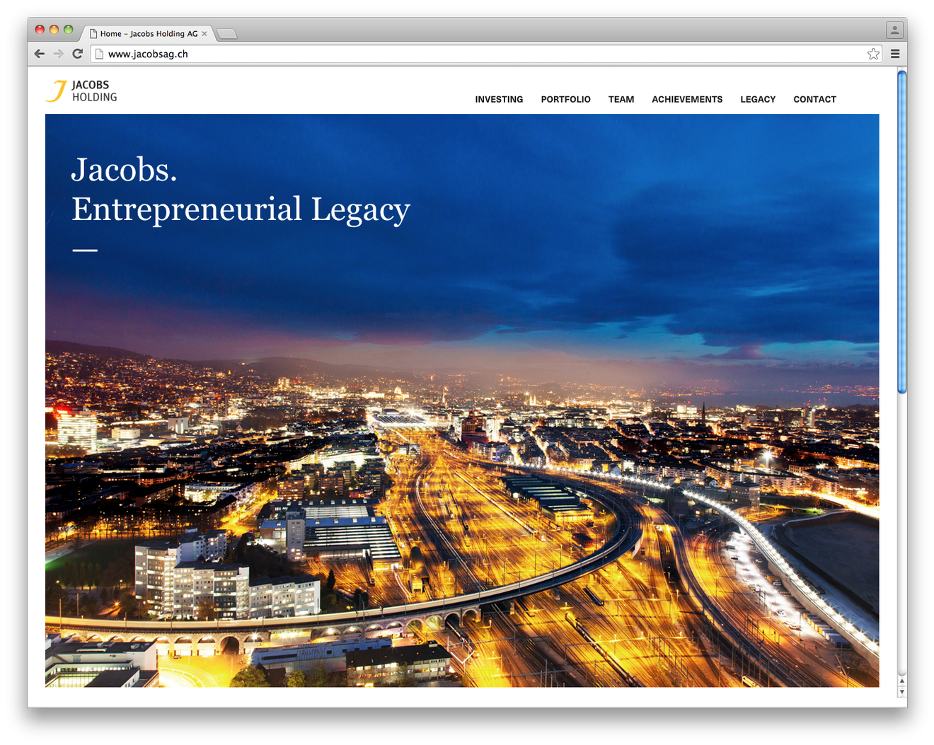 Our update of the Jacobs Holding website involved visualizing the metropolitan internationalism of the Jacobs endeavor, while remaining true to its local Zurich heritage and legacy. Photographers Roth+Schmid captured both with the Jacobs yellow in the autumn evening light of Zurich, their home at the lake.