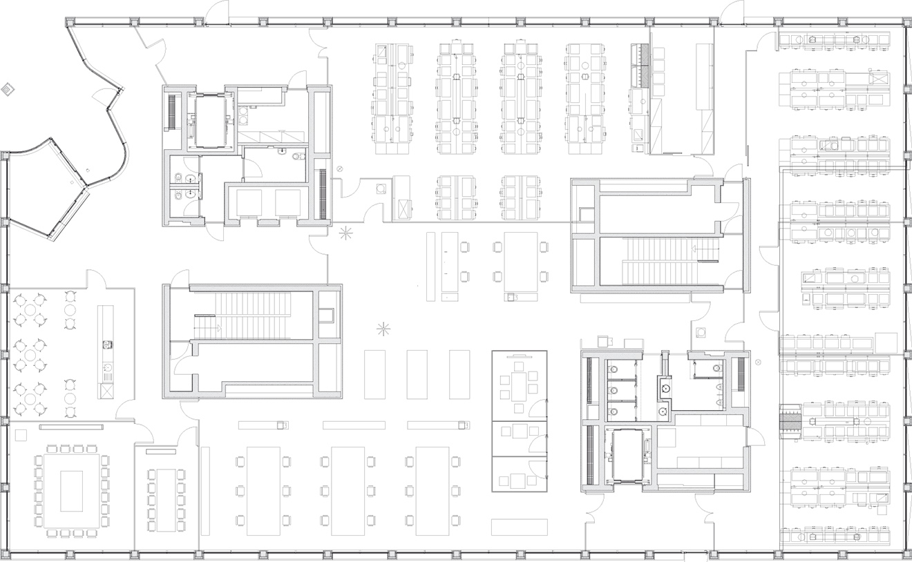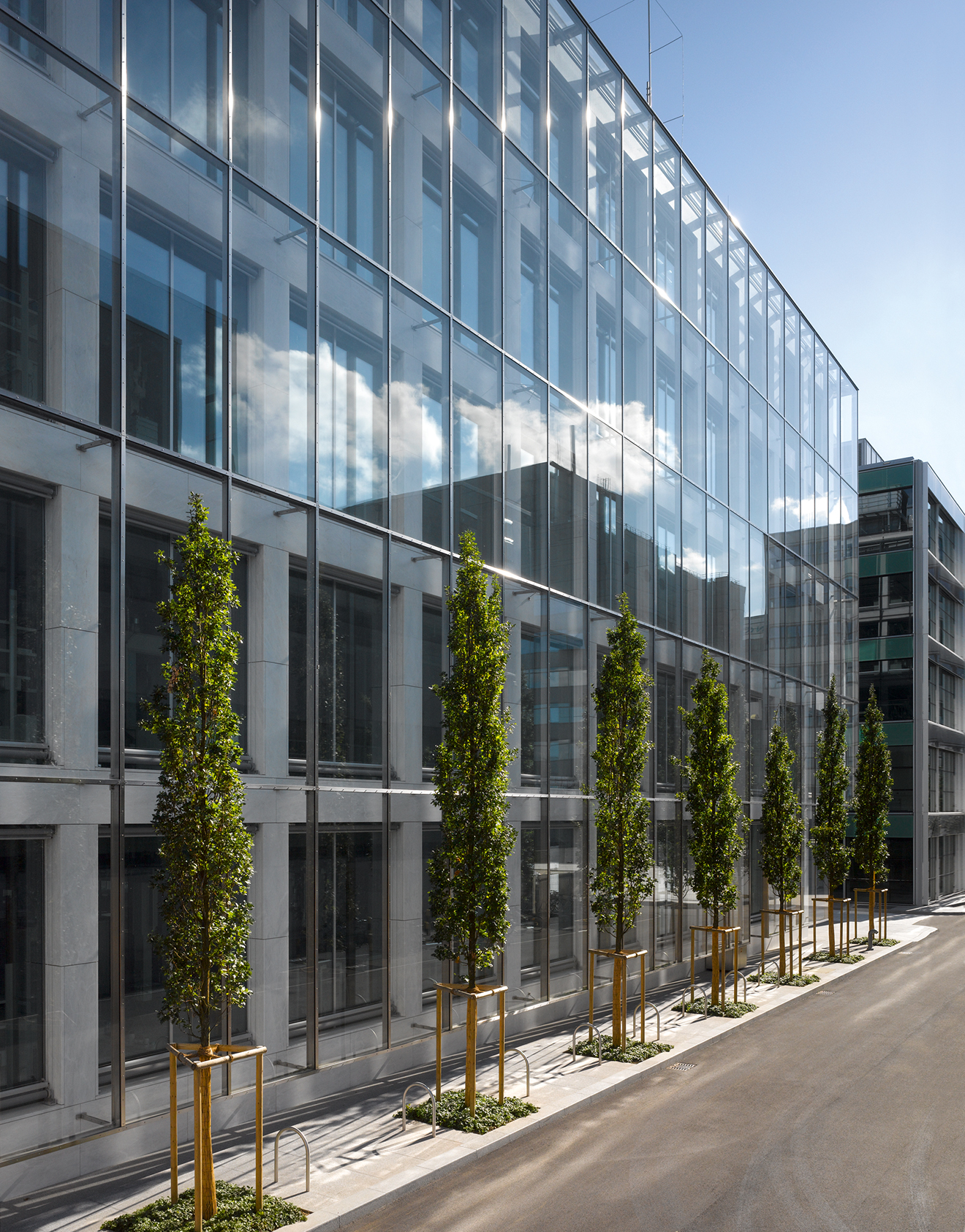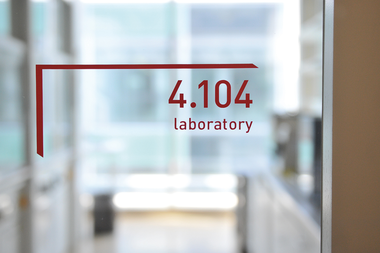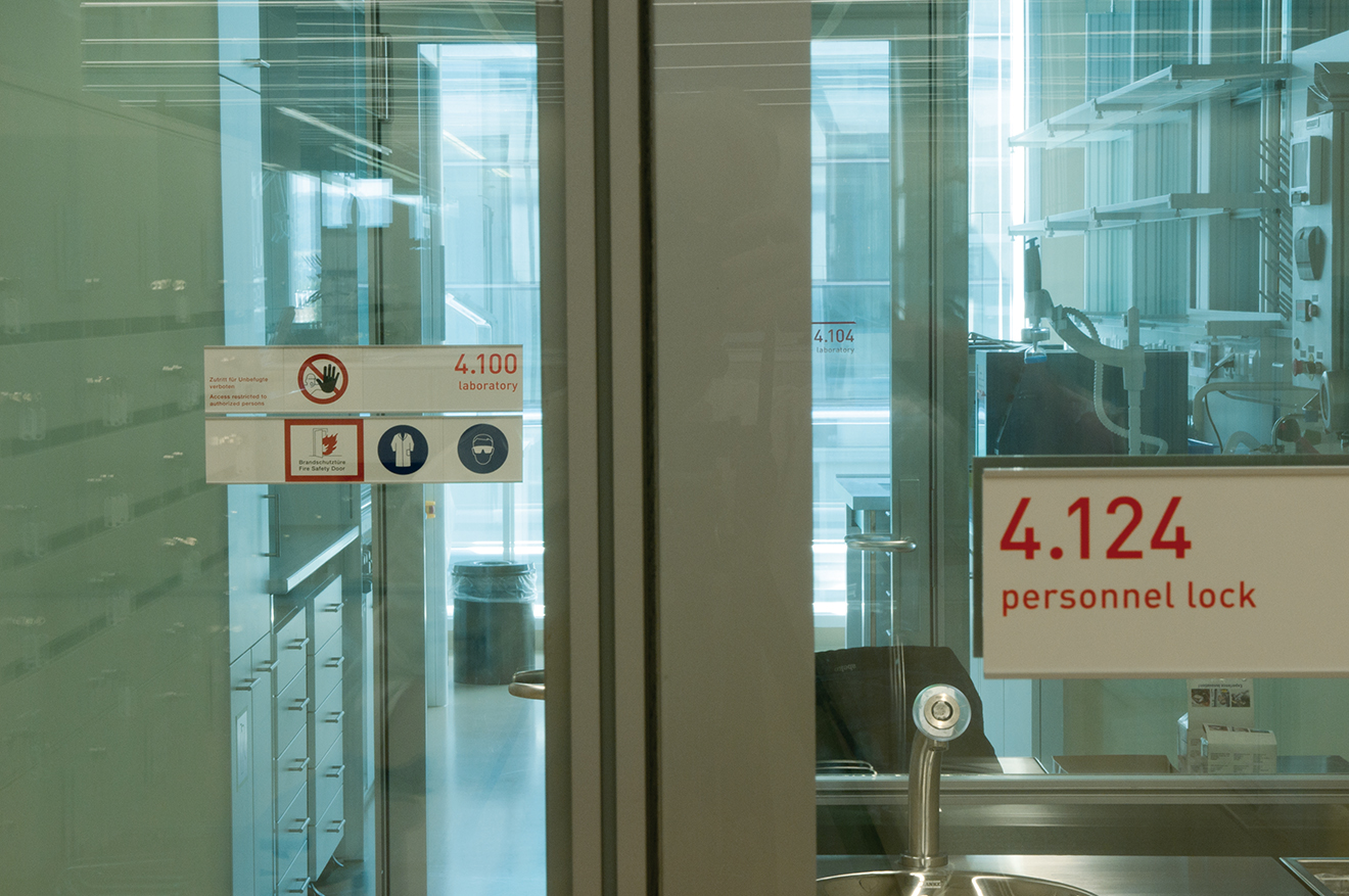 Not a trace of banal conventionality appears in Siza’s elegant new laboratory building so to echo the abandonment of the conventional and predictable, rectangular shadows of standard wall signage remain – in bright red. Normally hidden technical infrastructure was left exposed above the elegant, understated workplace environment. The red-alert color contrasts the monochrome interior while matching the exposed ceiling.