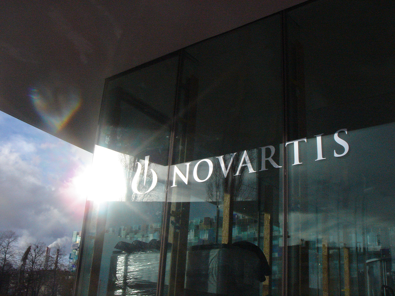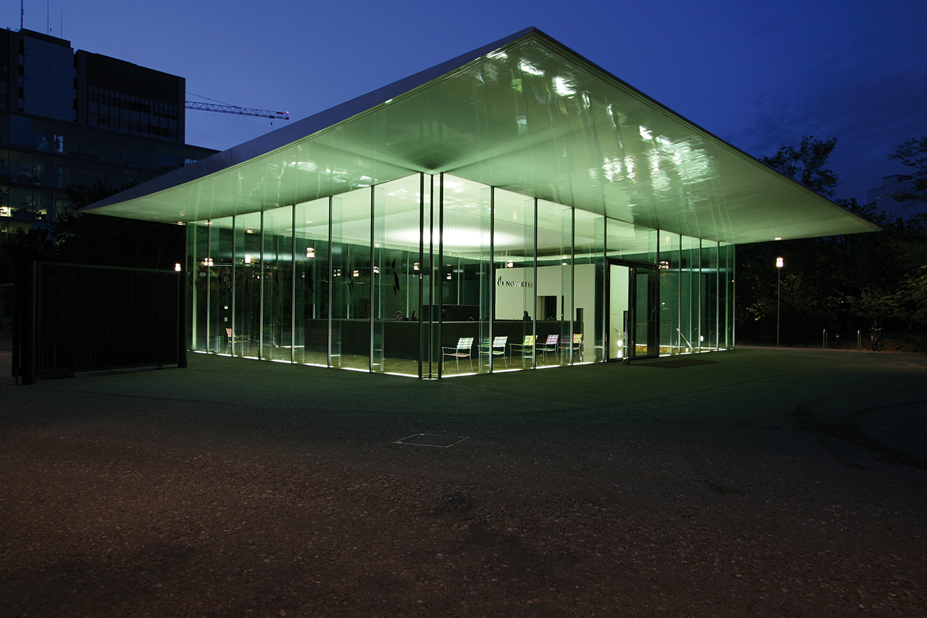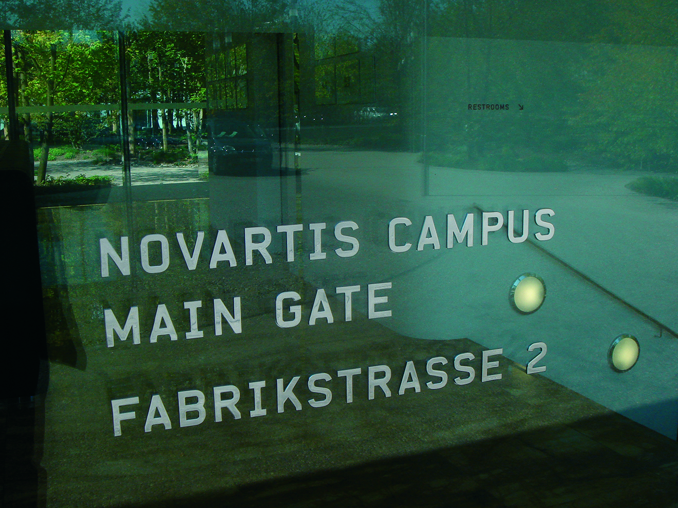 An elegant underground parking environment exits to the surface to become the entrance gate to Novartis Campus – a glass building with a 28-ton ceiling that seems to float as though lifted by the wind. For the Novartis logo, corporate design colors were renounced for these clean stainless steel letters mounted on the glass.