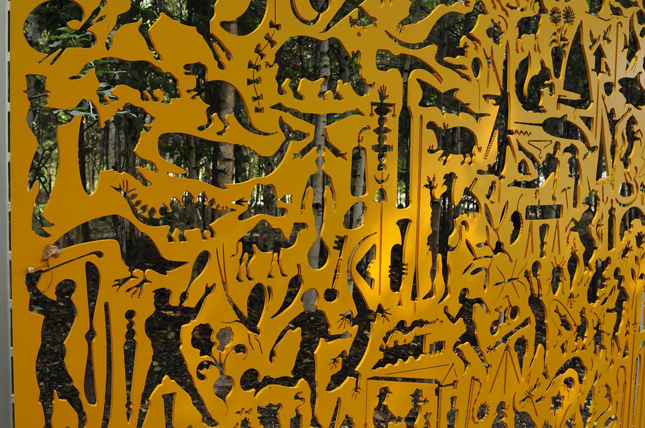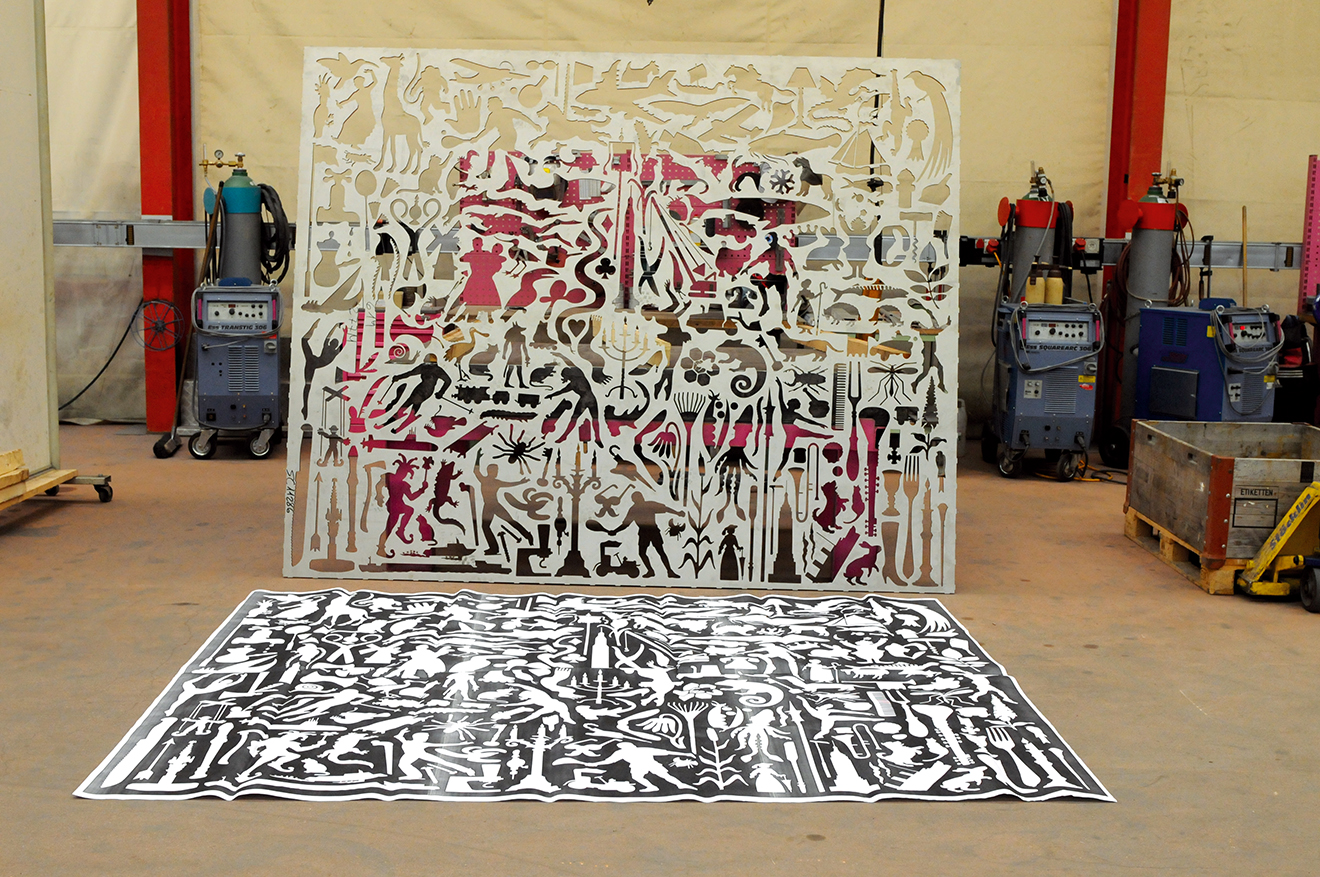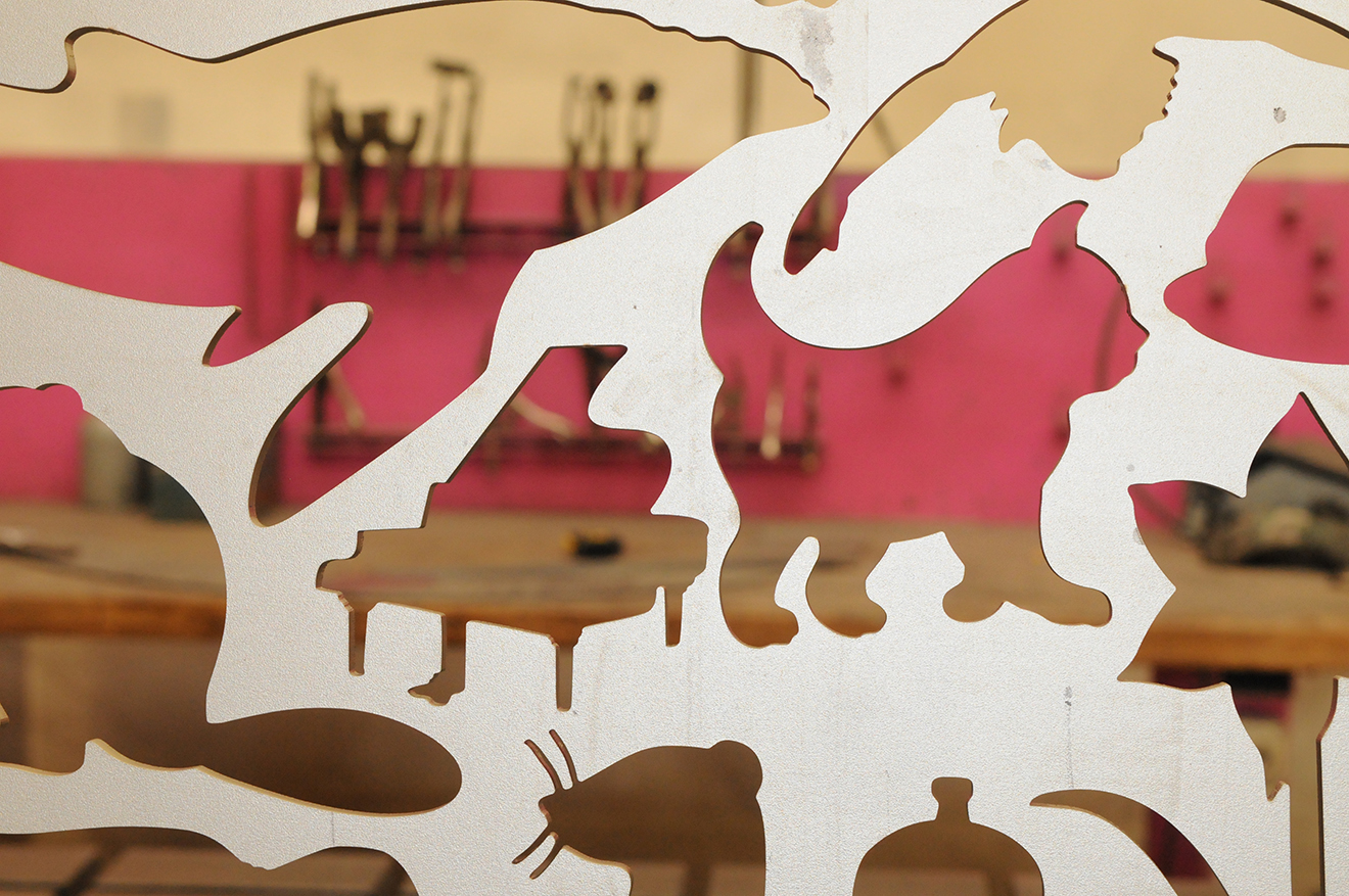 How would you keep people from wandering onto Novartis Campus from the adjacent park without seeming unfriendly?Alan Fletcher's idea was to create a wall of such entertaining imagery that people would feel respected by the effort to engage them, while being delighted to remain where they are. Andrew Davidson complied the imagery. Our job was production, which involved careful technical modifications to each sharp edge or negative space so that no little fingers or toes might accidently get caught or harmed. Then we had the 5 panels lasered out of 10mm thick steel, painted according to Fletcher's scheme, and mounted.