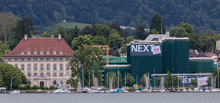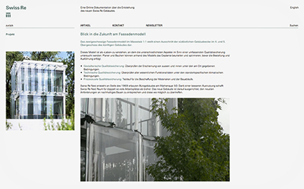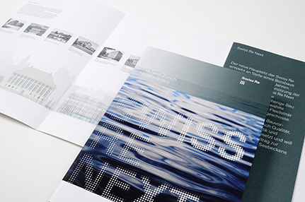The uniquely beautiful new Swiss Re headquarters being built on the banks of Lake Zurich by Diener & Diener Architekten references the lake for its dominant visual motif. The building‘s communications required an appropriately poetic interpretation of the corporate design. Ours showcased the sparkling lake view employees will be enjoying every day while also reflecting the architects‘ motif.