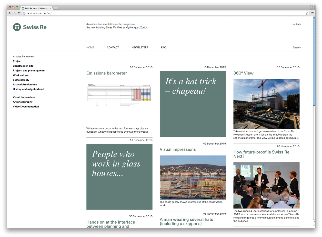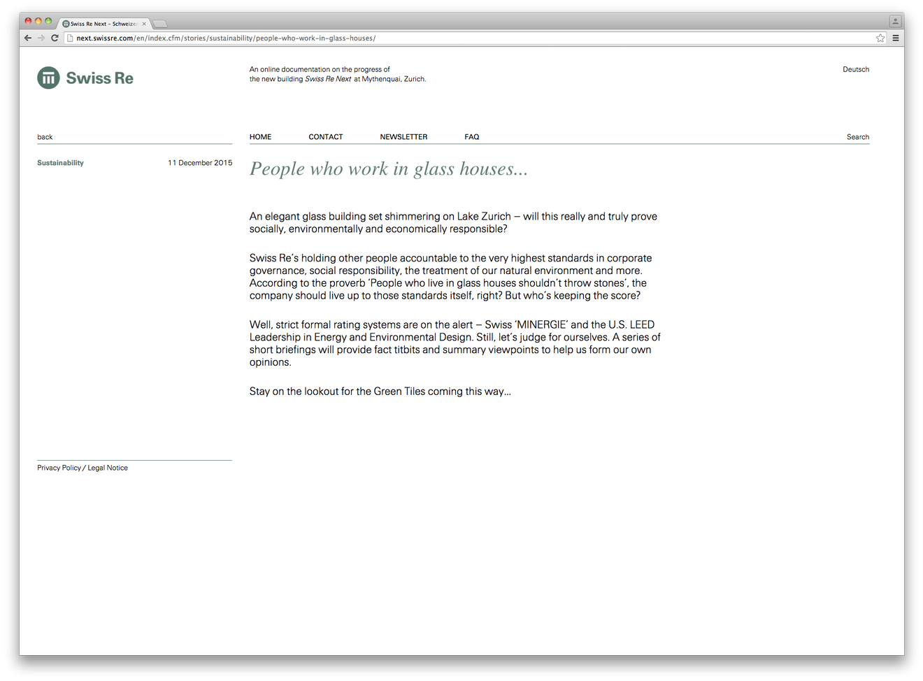 A new headquarters building expected to achieve platinum LEED (Leadership in Energy and Environmental Design) certification for sustainable building, required a communications concept detailing the company’s efforts. The microsite talks series, written by Lize Mifflin, provide engaging bite-size facts.