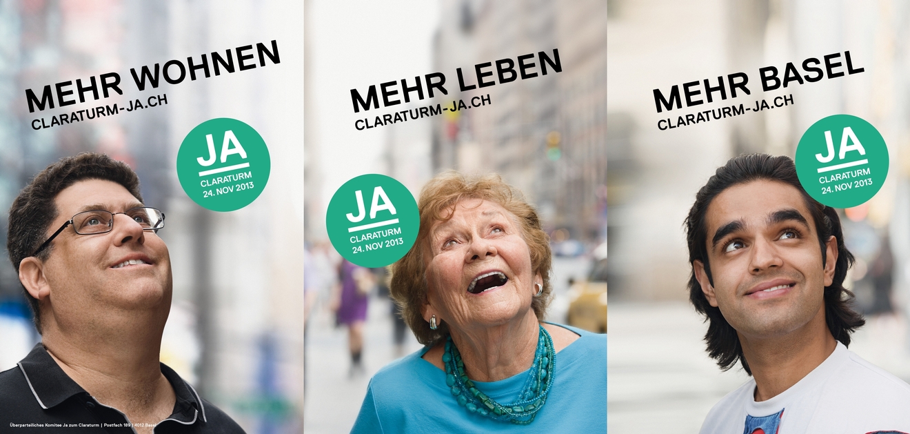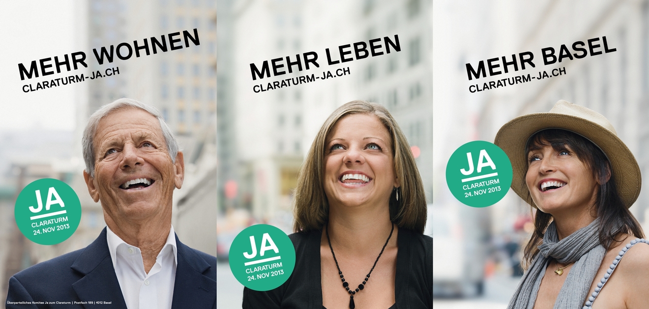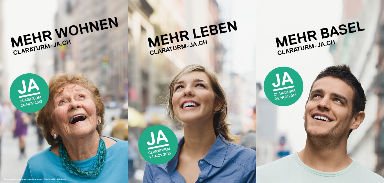 Questioning the wisdom of building a highrise at Messeplatz in Basel, despite the logic of saving green space by building upwards, a referendum was launched and a "Ja Claraturm Campaign" was requested. Showing various Baslers smiling while looking upward might have been instrumental in the positive voting results.