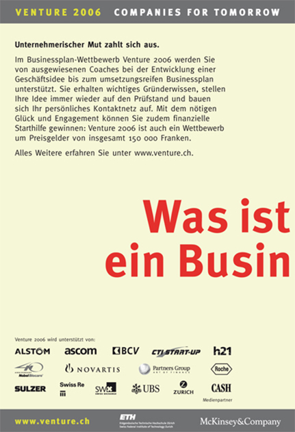 The ETH-McKinsey collaboration enabled brilliant business ideas to be presented in the Venture competition. Winners got support; many great new companies were launched. We launched the Venture visual identity.